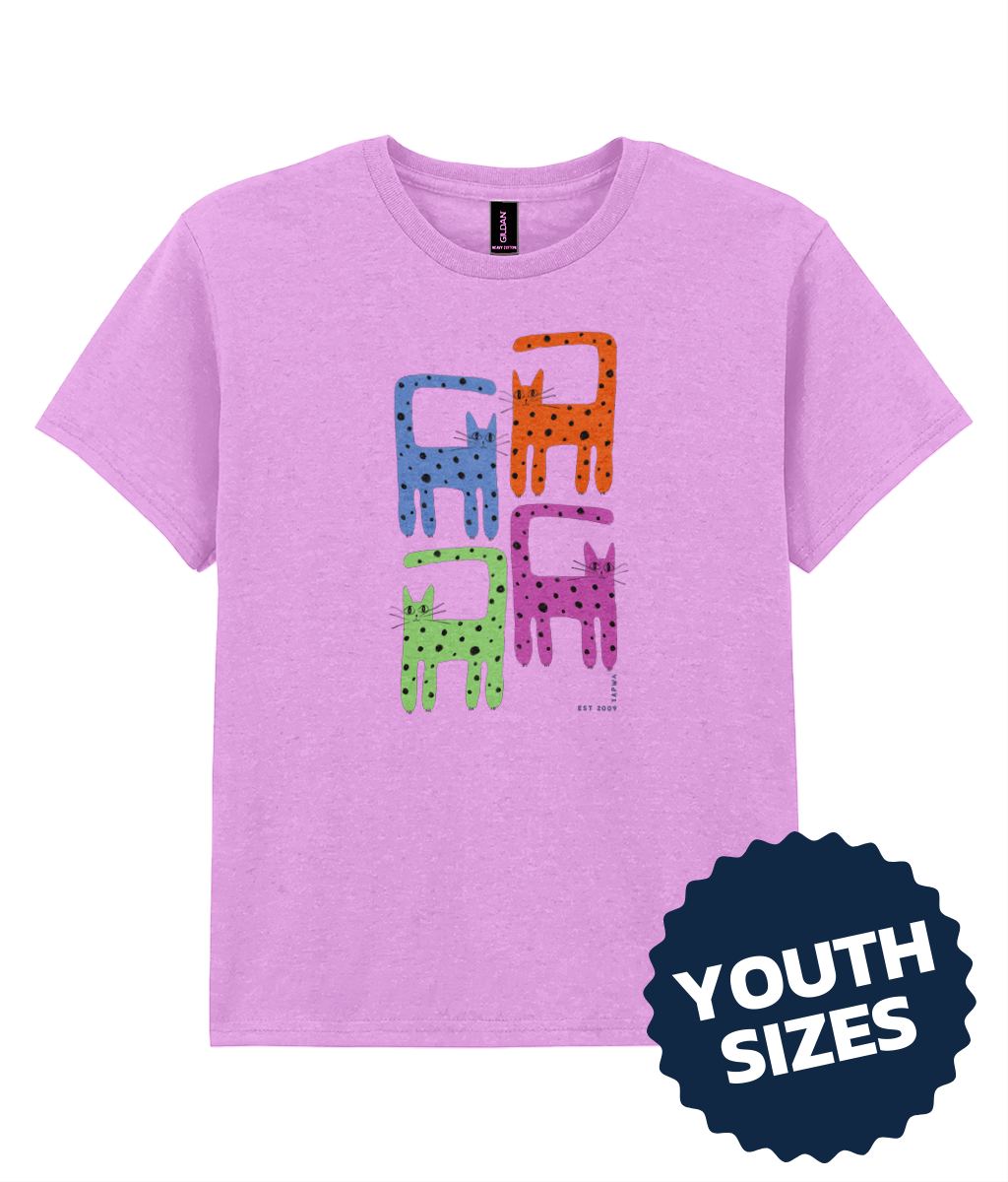 Express your love for cats with this purrfect t-shirt featuring an illustrative design of four spotty cats in vibrant colours by Kim Farrall. Available in a variety of colours to suit your style and printed on sustainable, ultra-soft materials for everyday comfort.